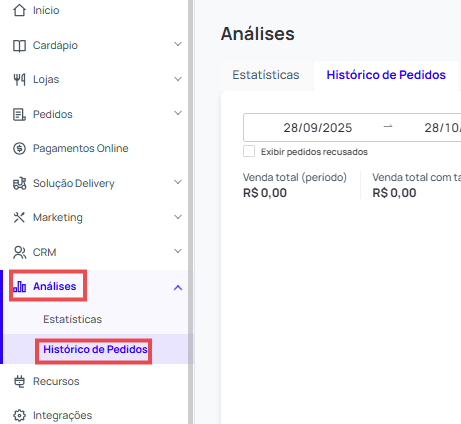 No menu lateral, vá em análises > Histórico de Pedidos.