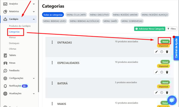 - Visível (verde): a categoria está ativa no cardápio.