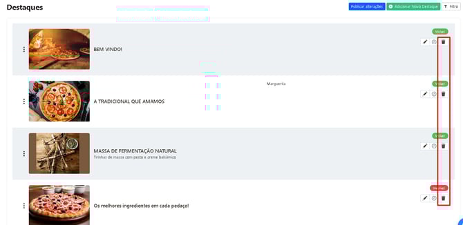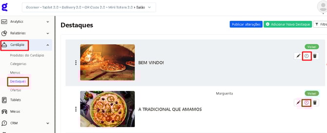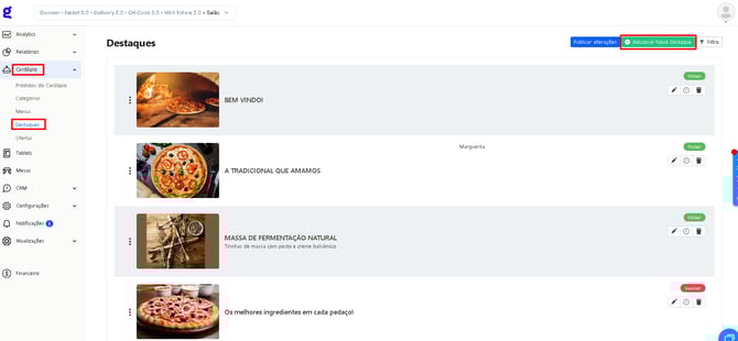 Aprenda como cadastrar, editar e excluir destaques no Painel de Controle, organizando melhor sua página inicial do cardápio.