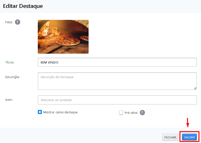 Item: Selecione o produto que será aberto quando o cliente tocar no destaque. Exemplo: Chopp Pilsen Promocional.