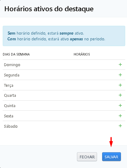 Configure os dias e horários em que o destaque fica disponível para exibição no cardápio e clique em Salvar.