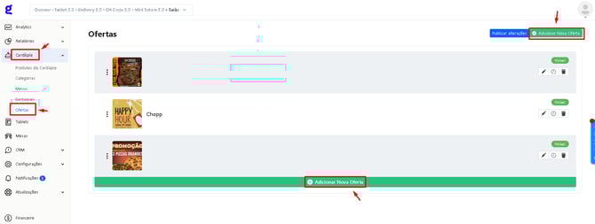 As ofertas são vantagens e descontos exibidos aos clientes no cardápio. Ao criar uma oferta, o sistema cria automaticamente um ícone de menu específico para ela. Este artigo explica como cadastrar, editar e excluir ofertas no painel.