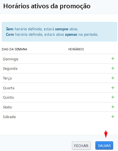 Configure os dias e horários em que a oferta fica disponível para exibição e venda no cardápio.