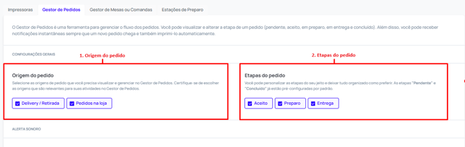 - Etapas do pedido: Esse é o ponto onde pode-se configurar quais etapas aparecerão no gestor. Etapas como Pendente e Concluído são etapas pré-definidas;