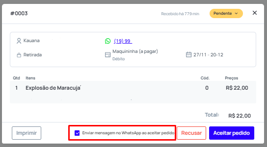 Também é possível enviar mensagem ao aceitar o pedido acionando a caixinha em frente ao Enviar mensagem no WhatsApp ao aceitar pedidos: