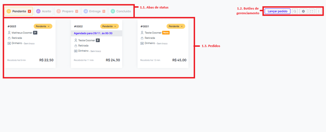 1.3 Pedidos: A maior parte da tela, onde encontram-se os pedidos.