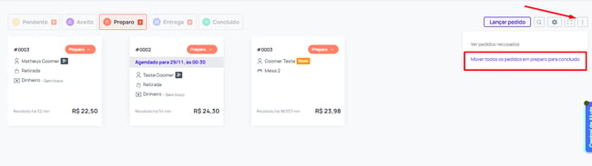 Também é possível concluir todos os pedidos em massa, a partir do status selecionado, clicando em Mover todos os pedidos [...] para concluído.
