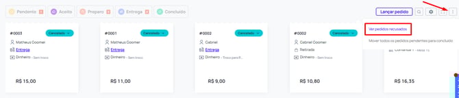 Por último, no botão de 3 pontos, será possível Ver pedidos recusados: