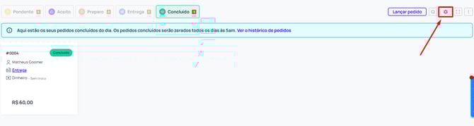 No canto superior direito, há alguns botões que podem ajudar na gestão dos pedidos e configurações gerais.