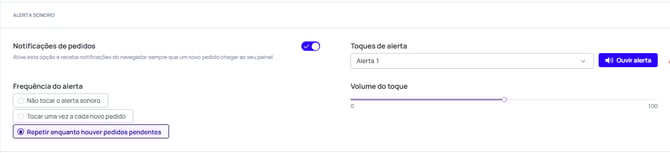 - Ajustar a Frequência do alerta. Quando o computador não é sempre visto, é indicado usar o Repetir enquanto houver pedidos pendentes, dessa forma, o toque continua enquanto o pedido não for aceito;