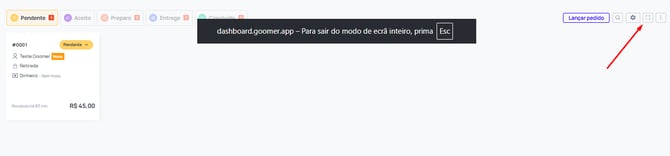 Voltando ao canto superior direito da tela principal do Gestor de pedidos, o botão de Tela cheia pode ser uma boa opção para lojas onde há um computador exclusivo para a gestão dos pedidos.
