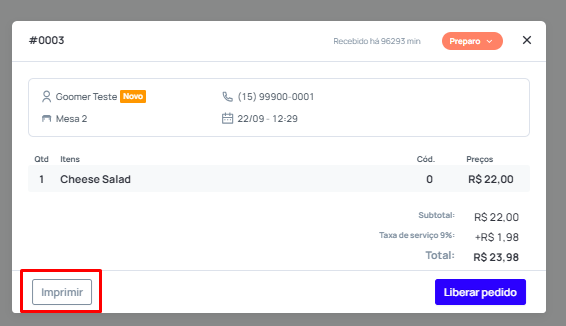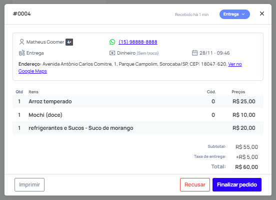 Aqui também será possível imprimir uma cópia do pedido clicando em Imprimir: