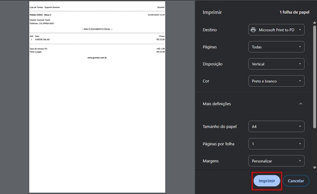 O navegador abrirá a janela de impressão para fazer ajustes finos da impressão. Após o ajuste, basta clicar em Imprimir na tela: