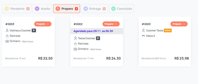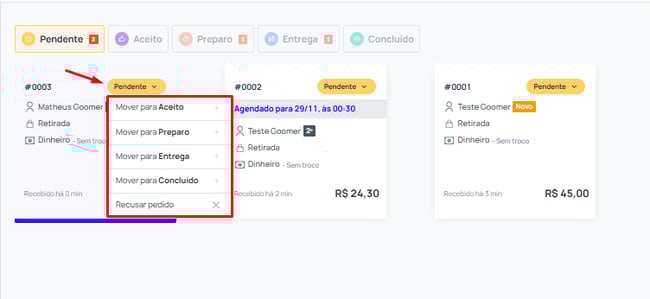 Ao escolher o status do pedido, ele mudará para a aba correspondente.