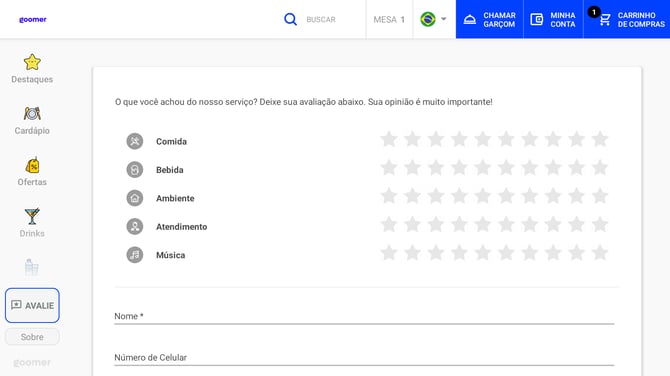 Permite que clientes deem notas e escrevam comentários sobre atendimento e cardápio.