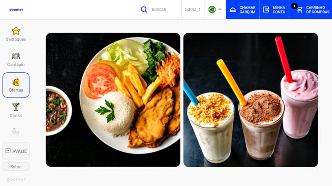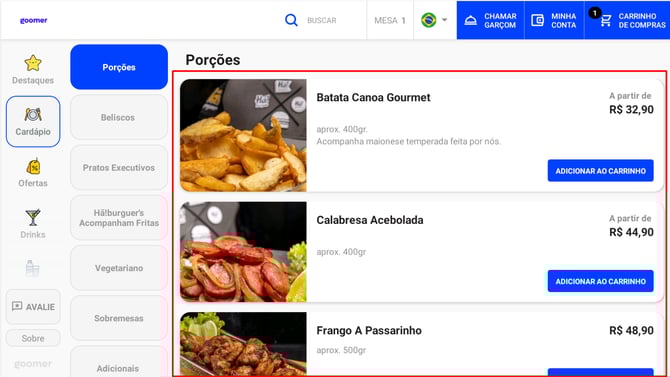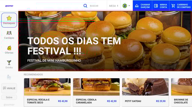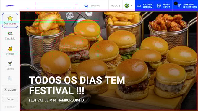 A interface do Goomer foi projetada para ser intuitiva e prática, garantindo a melhor experiência possível para o cliente. Os menus foram organizados de forma clara e objetiva, evitando confusões durante a utilização.