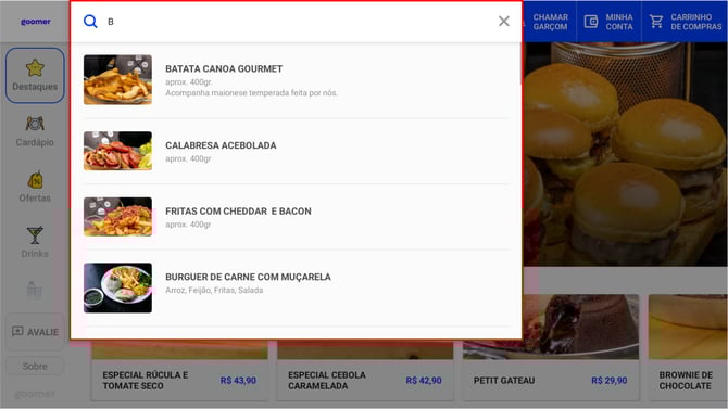 O botão Buscar localiza produtos rapidamente pelo nome. É útil para clientes já familiarizados com o cardápio.