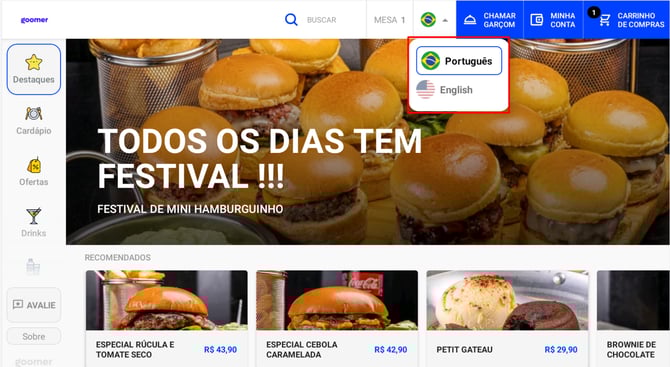 O Goomer disponibiliza três opções de idioma para o cardápio: Português, Inglês e Espanhol.