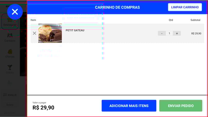 Mostra o pedido atual em aberto antes do envio, funcionando como um carrinho de compras tradicional.