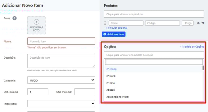 Dica: crie um novo opcional clicando em + Modelo de opção.