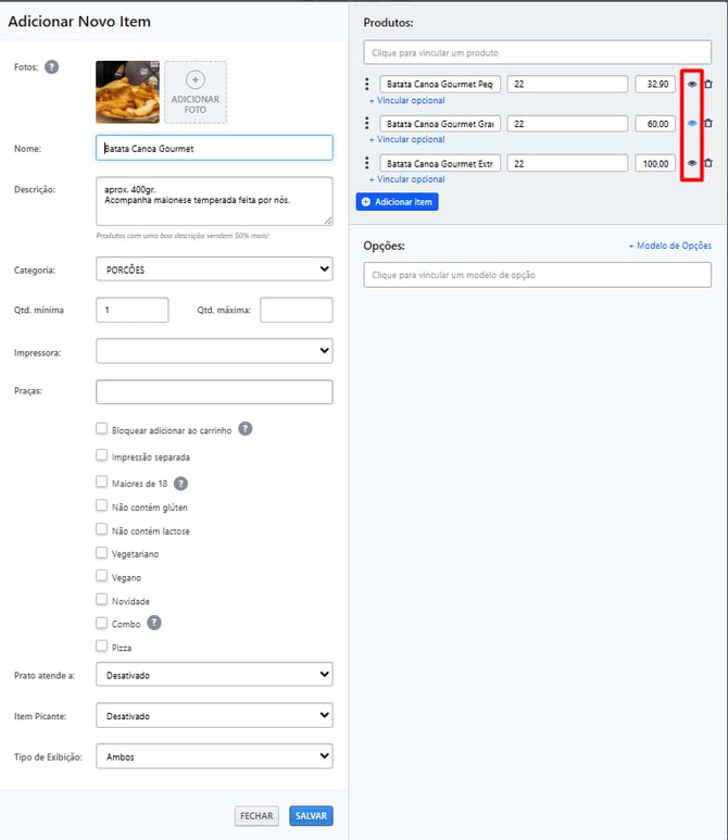 Utilize para ocultar itens do cardápio quando estiverem indisponíveis ou não devam aparecer em determinada categoria.