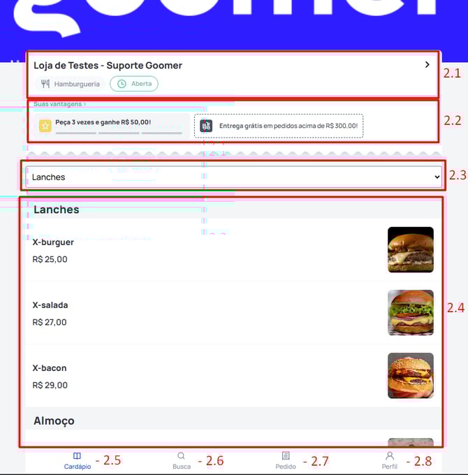 A interface do delivery Goomer mantém uma navegação simples e organizada. Os menus são claros e posicionados estrategicamente para facilitar o uso e evitar confusão durante a jornada do cliente.