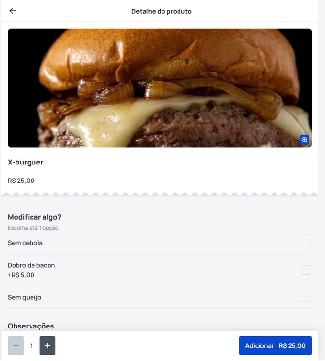 Ao selecionar um produto, o cliente visualiza a tela de detalhes.