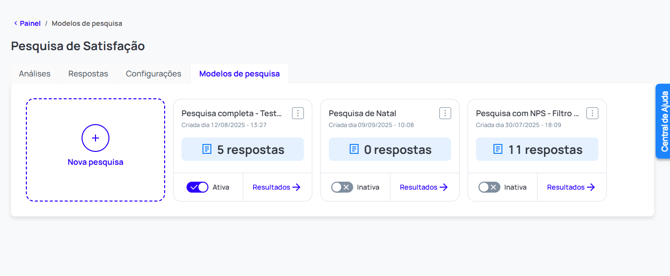 - No módulo da Pesquisa de Satisfação, clique em “Modelos de Pesquisa" e após "Nova pesquisa"