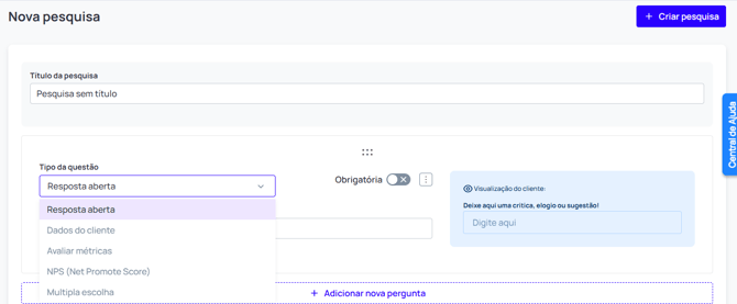 3. Após escolher o tipo de questão, configure as suas perguntas, após salve a pesquisa.